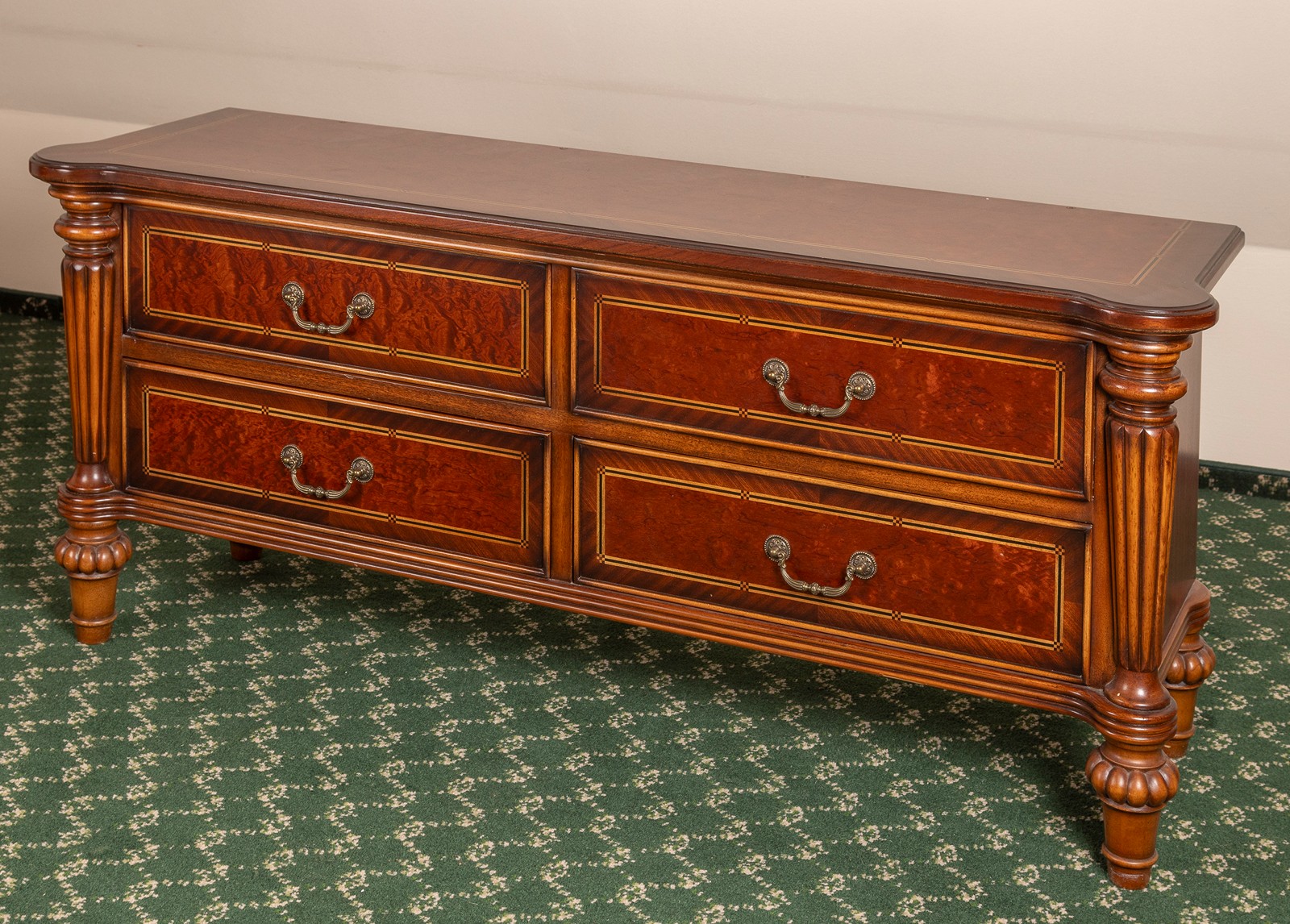 novodobé, dřevo, dýhováno exotickými dřevy a kořenicí, intarzovaná linka, v rozích řezané sloupky