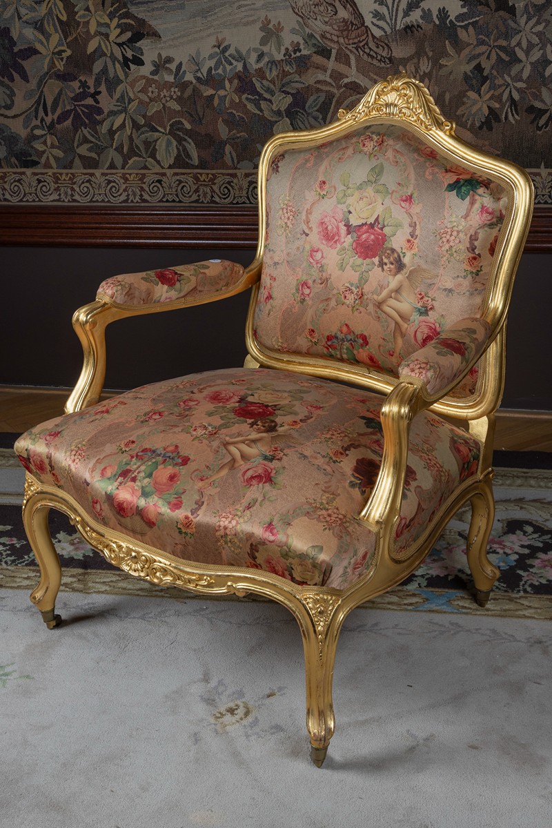 20. století, dřevo řezané, zlacené, čalouněný sedák a opěradlo s tištěným dekorem v rokokovém stylu