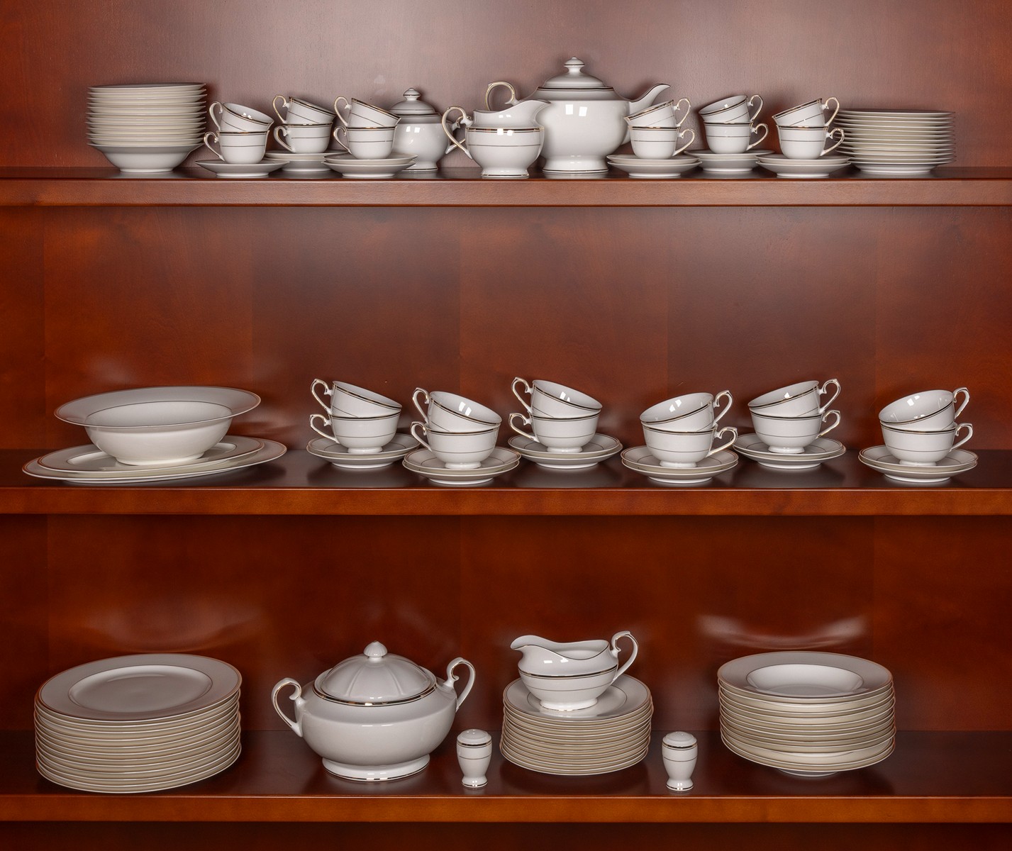 novodobé, porcelán, zdobeno zlatou linkou, obsahuje: 12 mělkých, 12 hlubokých, 12 desertních, 12 předkrmových talířů, 12 misek na kompot, 12 koflíků s miskami na kávu, 12 koflíků s miskami na čaj, konvice, cukřenka, mléčenka, 2 slánky, terina s víkem, omáčník, zn. Auratic, Čína