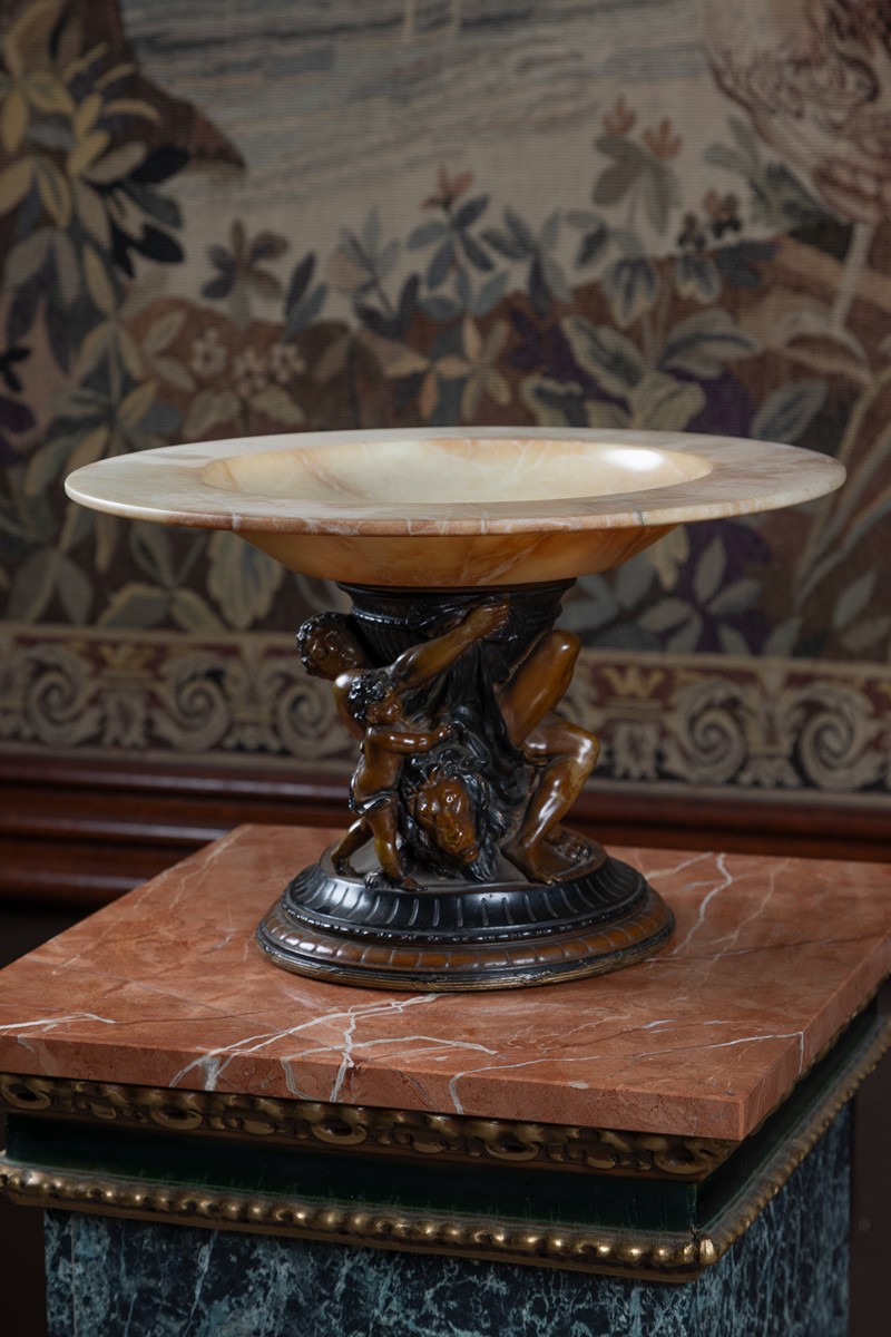 1. čtvrtina 20. století, Německo, bronzová noha s motivem muže na lvu, miska béžový mramor
