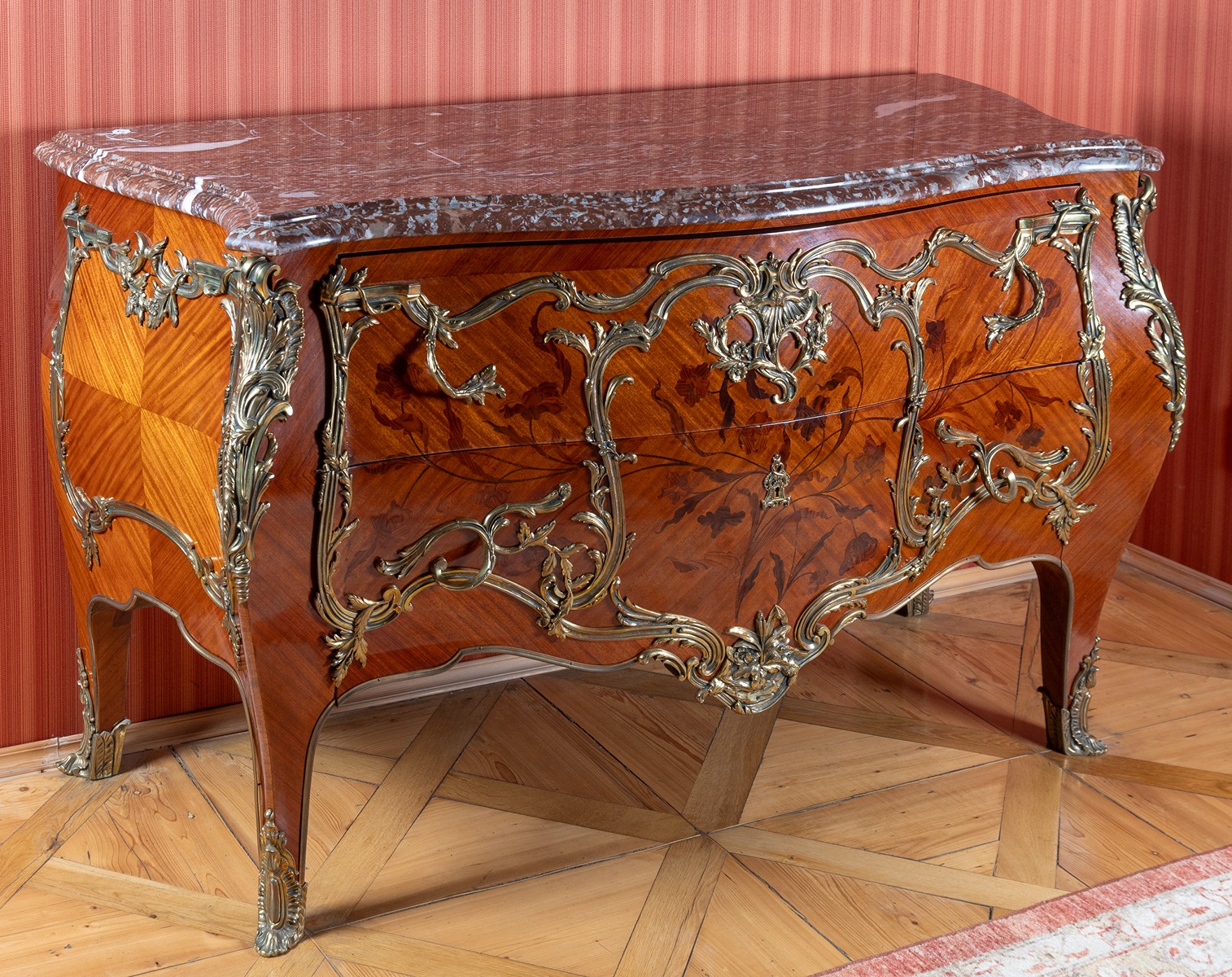 konec 19. století, Francie, ve stylu Francois Linke, dřevo, mahagonová dýha, intarzováno exotickými dřevy, geometrické motivy a rozviliny, čtyři projmuté nožky, dvě zásuvky bohatě zdobené bronzovými aplikami, vrchní deska z žilkovaného šedovínového mramoru