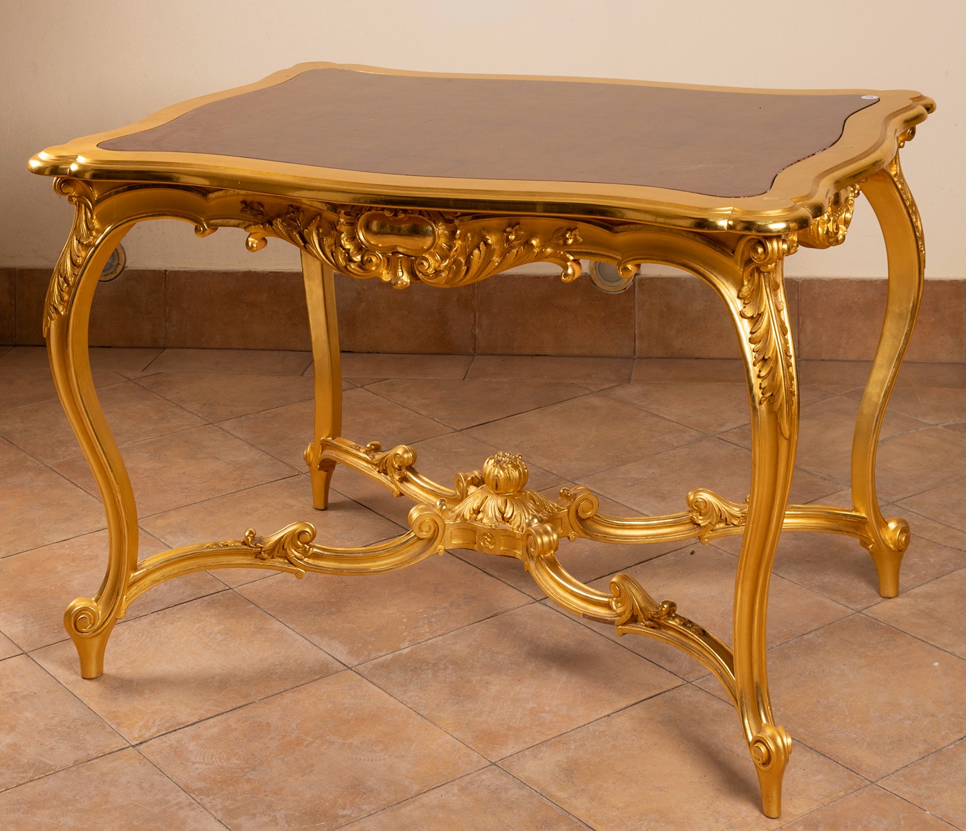 19. - 20. století, dřevo řezané, zlacené, vsazená dřevěná deska dýhovaná kořenicí, čtyři esovité nohy spojené trnoží