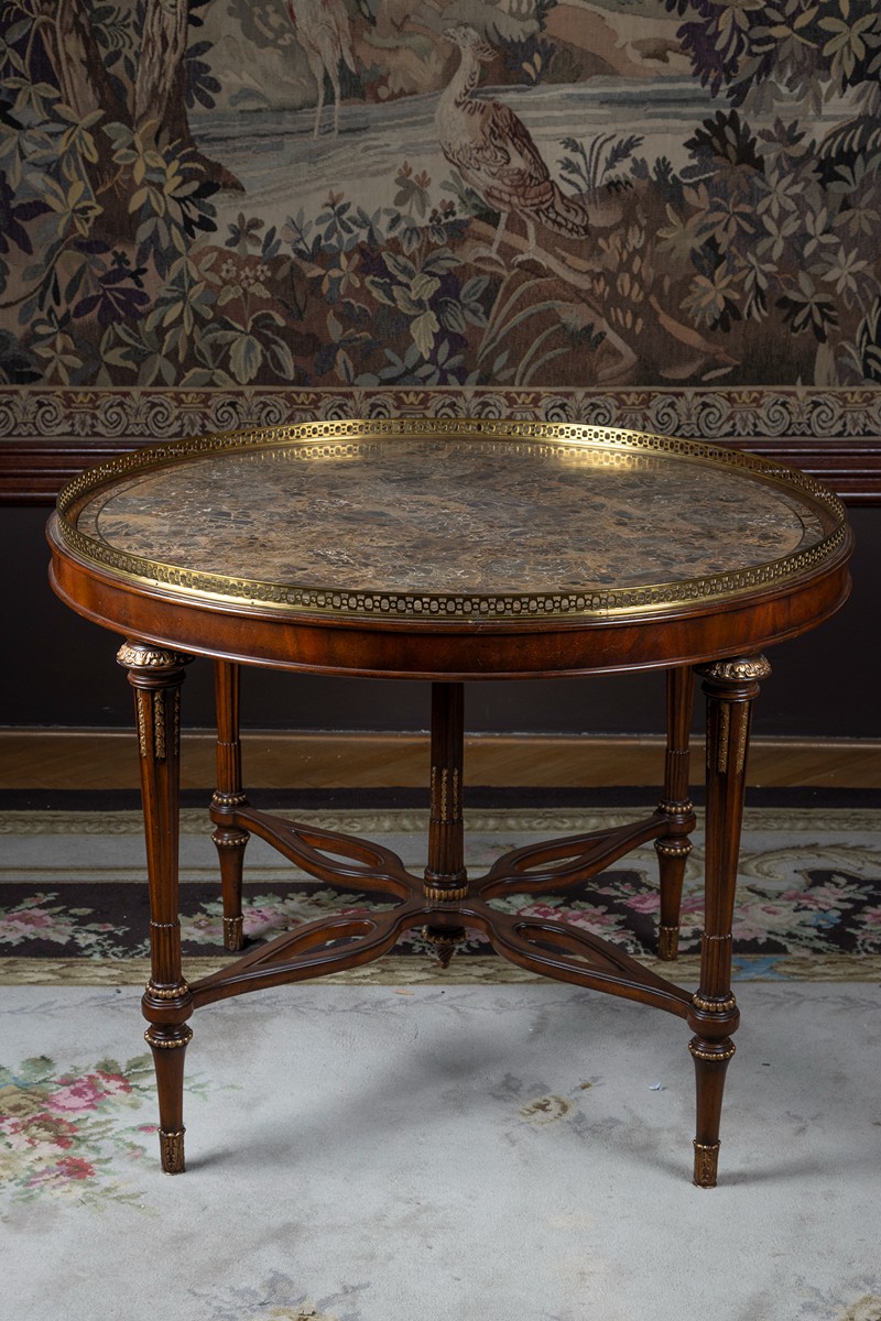 novodobé, exotické dřevo, řezané, částečně zlacené, kruhová deska z šedého žilkového mramoru, mosazné apliky a rámování desky