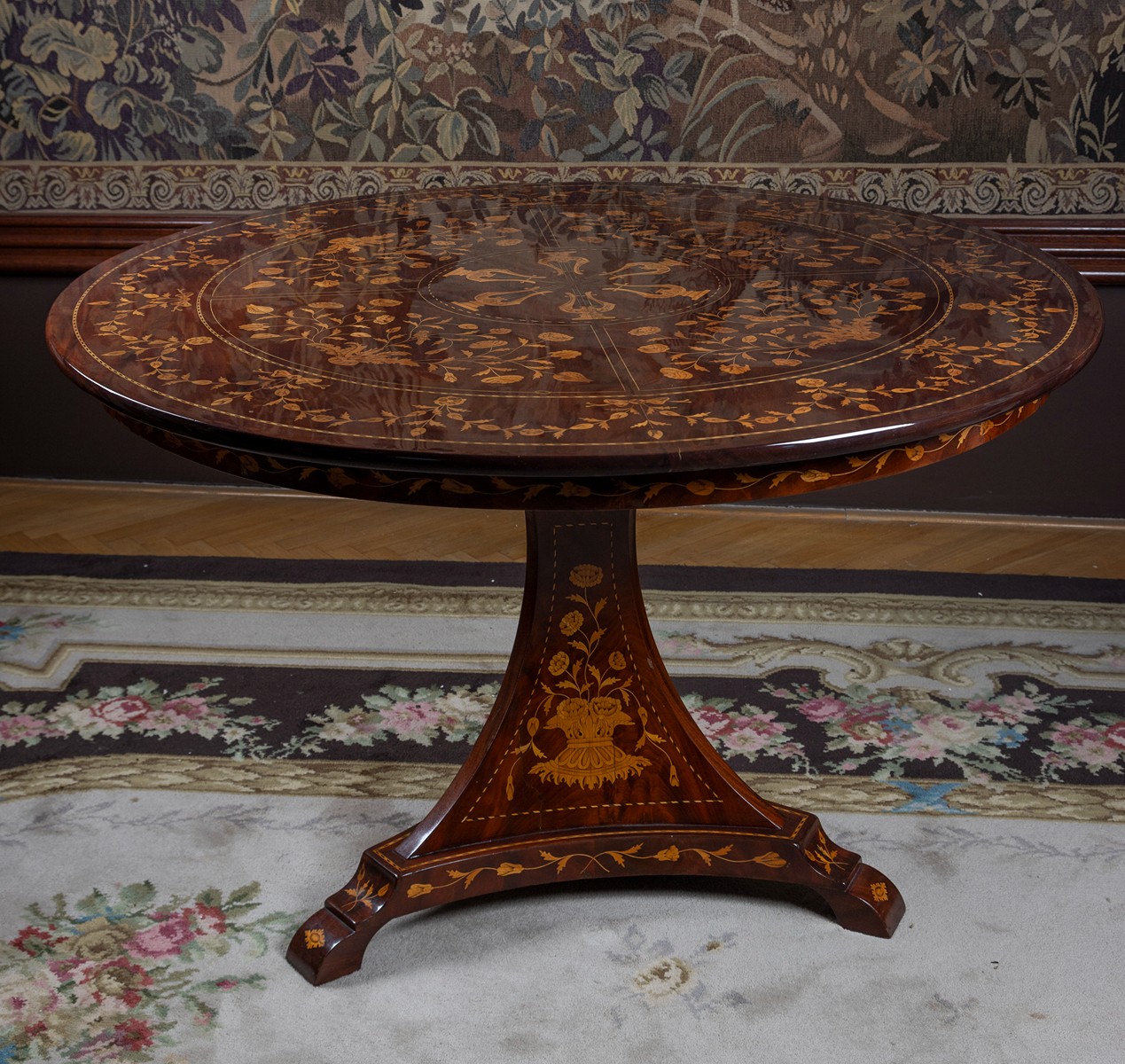 20. století, Holandsko, dřevo, mahagonová dýha, bohatě interzované motivy rozvilin s ptáčky a lyrami světlou dýhou v holandském stylu, centrální trojboká noha