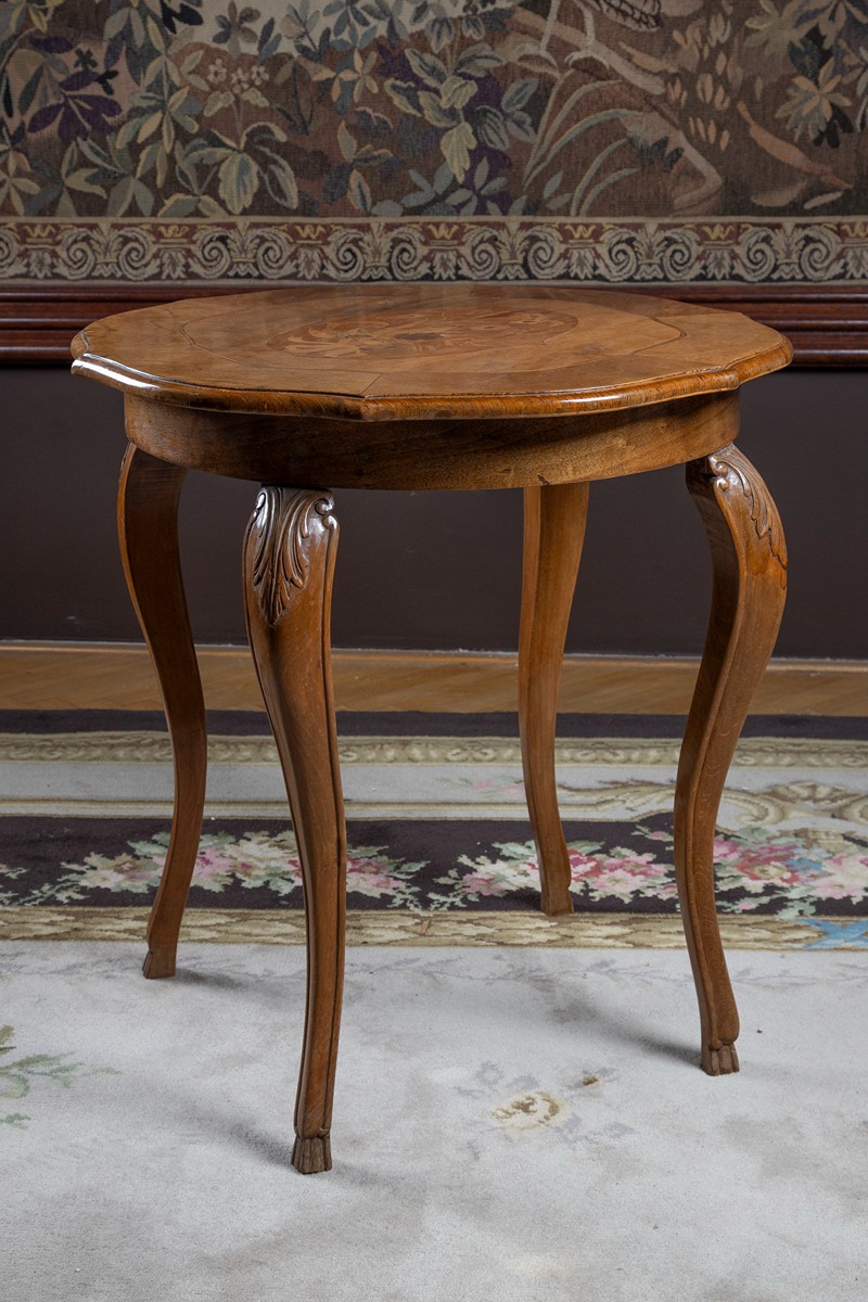 1. pol. 20. století, dřevo dubové, řezané, čtyři esovité nohy, kruhová deska s intarzí kytice