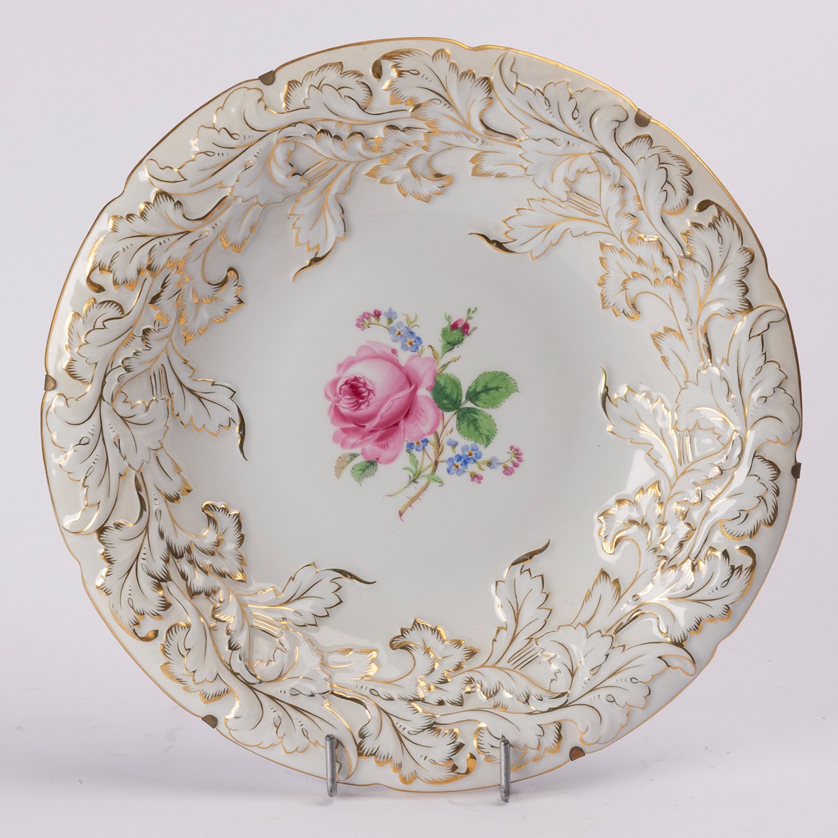 1924 - 1934, porcelán, plastické zlacené akantové listy, pestře malovaná růže, modrá značka mečů pod glazurou