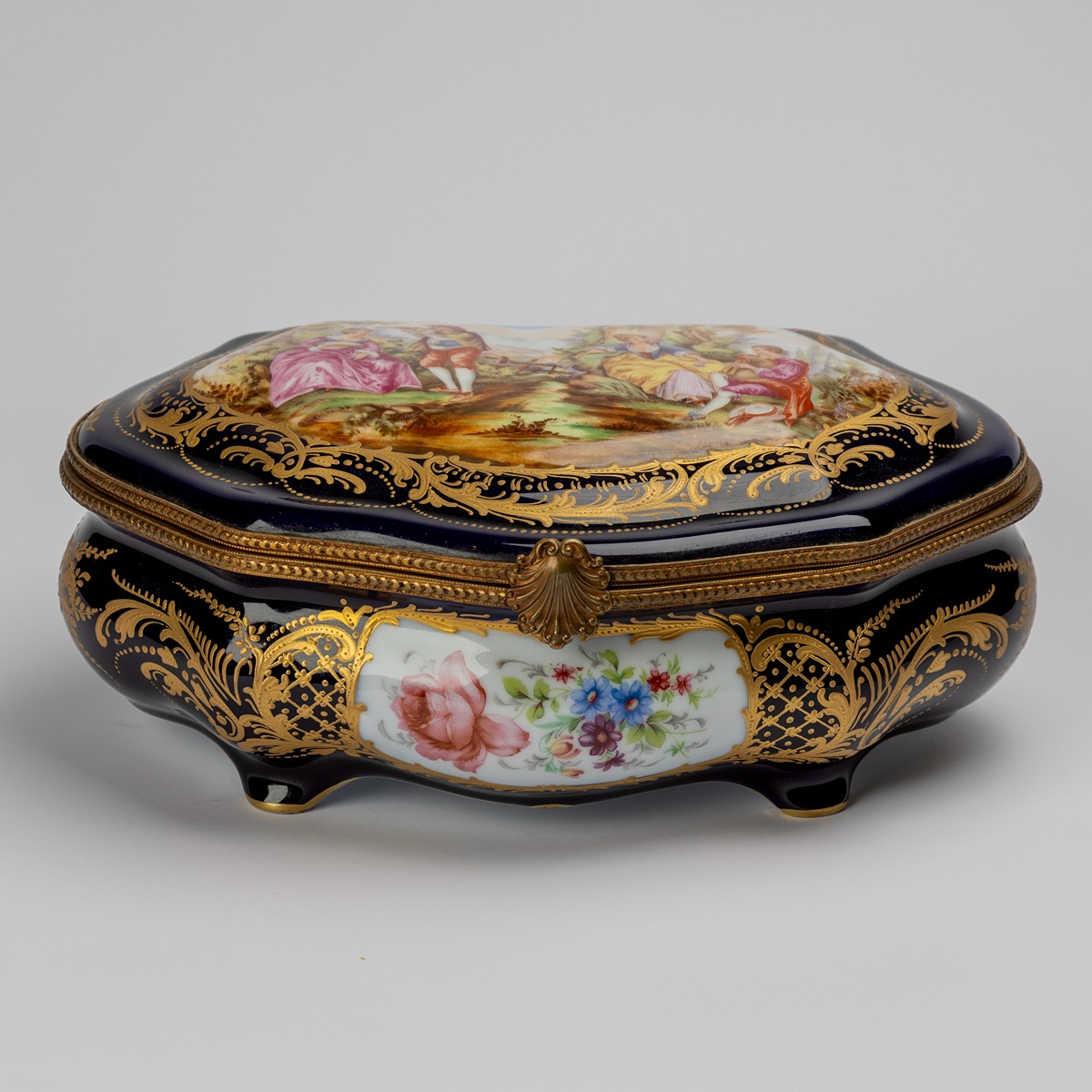 1. pol. 20. století, Německo, porcelán, kobaltový fond, zlaceno, pestře malované galantní výjevy, mosazná montáž, nepravá značka Sevres