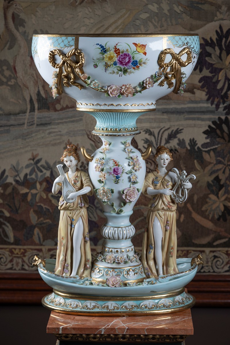 novodobé, porcelán, oválná základna ve tvaru lodě, na ní dvě stojící ženy s hudebními nástroji, uprostřed mísa na noze, zdobeno pestrou malbou, plastickými květy a zlacenými girlandami, značeno, Německo