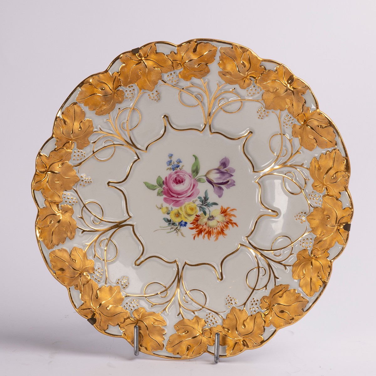 poč. 20. století, Míšeň, porcelán, reliéfní zlacený dekor, pestře malovaná kytice, modrá značka mečů pod glazurou