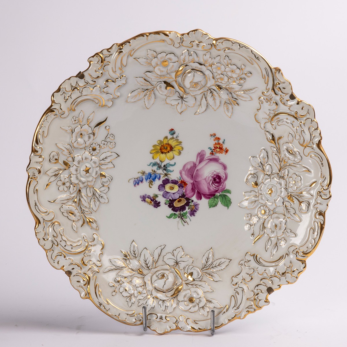 1924 - 1934, Míšeň, porcelán, reliéfní zlacený dekor, pestře malovaná kytice, modrá značka mečů pod glazurou