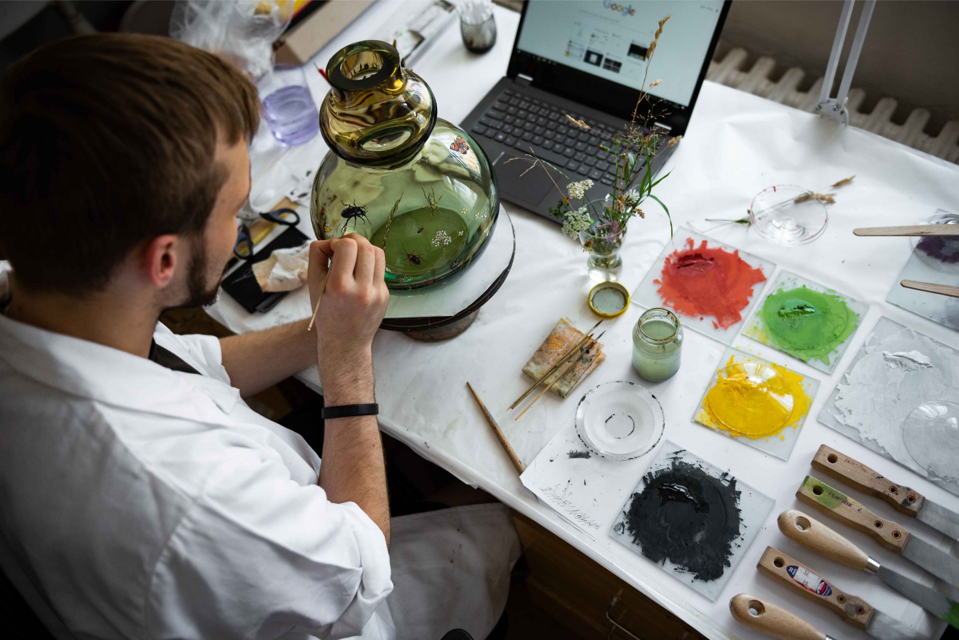 FRANTIŠEK: Dneska se rozhodně nestydím za to, že mám na pestrobarevné váze ještěrku – je to pro mě navazování na prověřené sklářské řemeslné i estetické principy, které posouvám z čistě řemeslné roviny do volné vizuální tvorby. Ale vzpomínám na vysokou, kde jsem namaloval motiv Hello Kitty a pak jsem se to dílo skoro styděl vystavit. Když jsem nad tím ale posléze přemýšlel, uvědomil jsem si, že překlápěním těchto silně popkulturních motivů do ryze řemeslného ručního zpracování jim propůjčuji novou autenticitu. Od tohoto bodu se tím bavím.