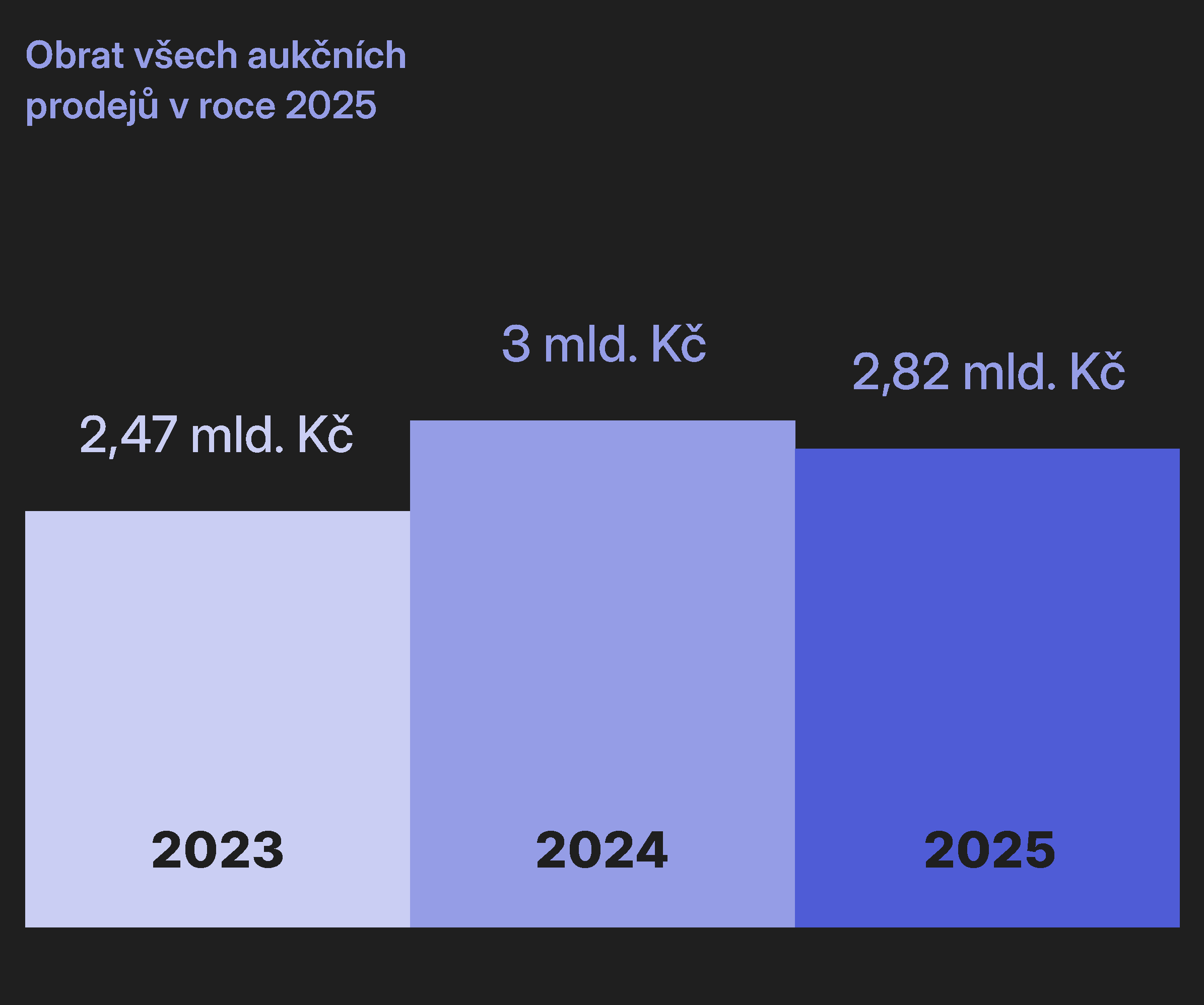 Loňský aukční rok se nesl v duchu lehkého poklesu. Oproti roku 2024 celkový objem prodejů poklesl bezmála o 6,5 % z rovných 3 miliard na 2,82 miliardy korun. Je ovšem důležité dodat, že nabídka meziročně vzrostla zhruba o 30 tisíc položek. Trh se tedy nezmenšuje, naopak se stává širším a dostupnějším. Zajímavý vývoj můžeme sledovat i v počtu prodaných položek.