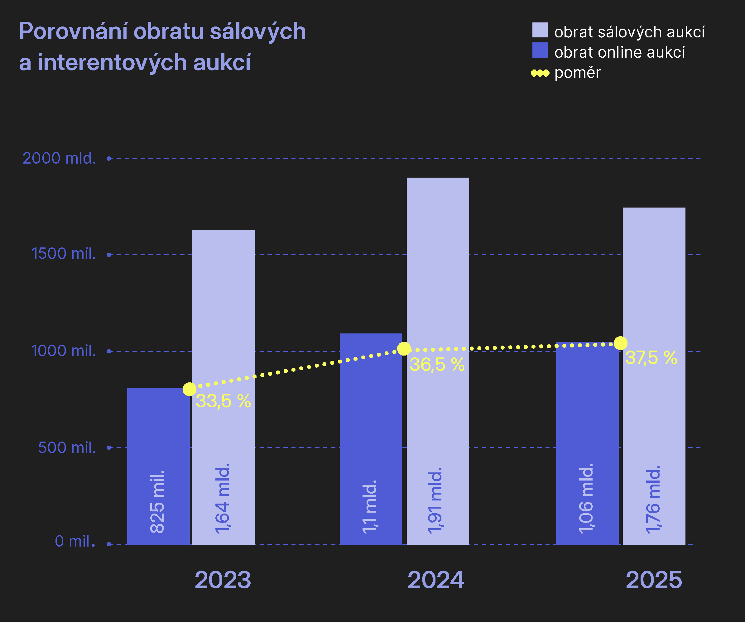 Data potvrzují pokračující trend přesunu aukčního trhu do online prostředí. Zatímco na sálových aukcích se ve srovnání s rokem 2024 prodalo zhruba o 400 položek méně, v online aukcích se naopak prodalo o 13,5 tisíce položek více, celkem přes 89,6 tisíc. Počet sálových aukcí se přitom v zásadě nezměnil a jejich nabídka zůstává stabilní. Naopak online aukce dlouhodobě rostou a každým rokem výrazně rozšiřují celkovou nabídku na trhu.