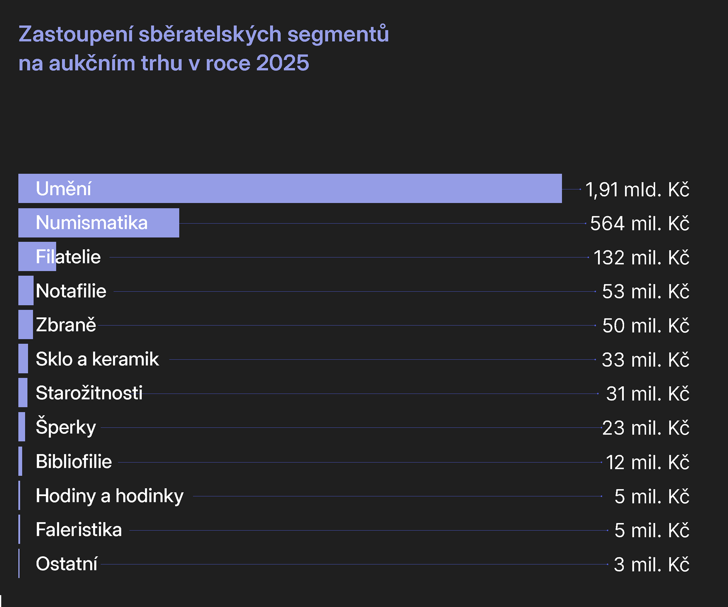 Umění si i v roce 2025 v celkovém obratu 1,91 miliardy korun stále drží nezpochybnitelné prvenství. Ačkoli tato kategorie zaznamenala nejvýraznější meziroční pokles (o 349 milionů korun), tvořila bezmála 68 % celkového objemu trhu a nadále tak určuje vývoj domácího aukčního prostředí. Na druhém místě se drží numismatika, která s obratem 564 milionů korun oproti loňskému roku vzrostla o 23 % a patří tak k nejvýrazněji rostoucím segmentům. Mezi další rostoucí segmenty patří filatelie, sklo a keramika, starožitnosti a také nově sledovaná kategorie historické a sběratelské zbraně, která letos dosáhla objemu 50 milionů korun. Pokles obratu se projevil u kategorií notafilie, šperky, faleristika, bibliofilie a hodiny a hodinky.