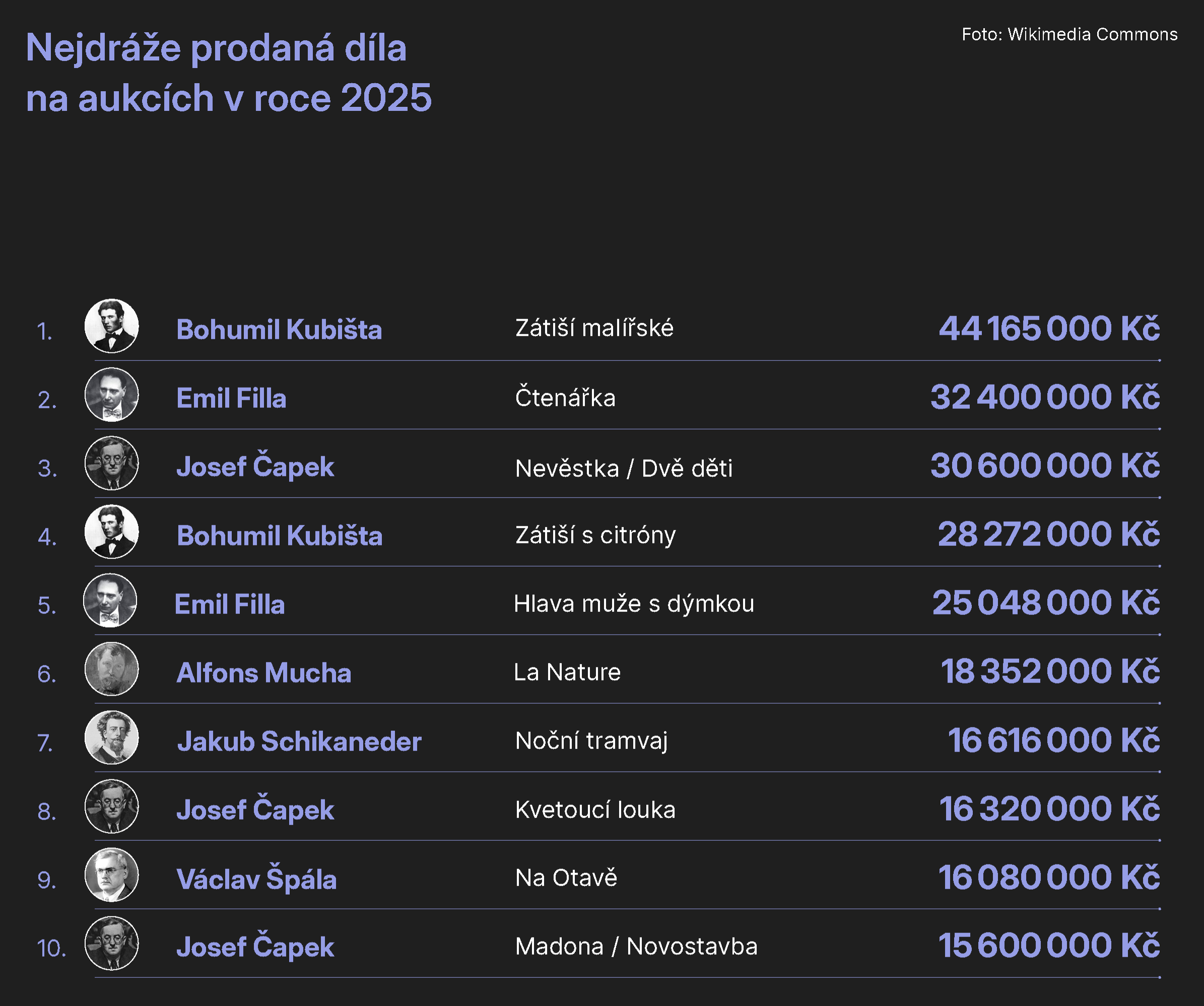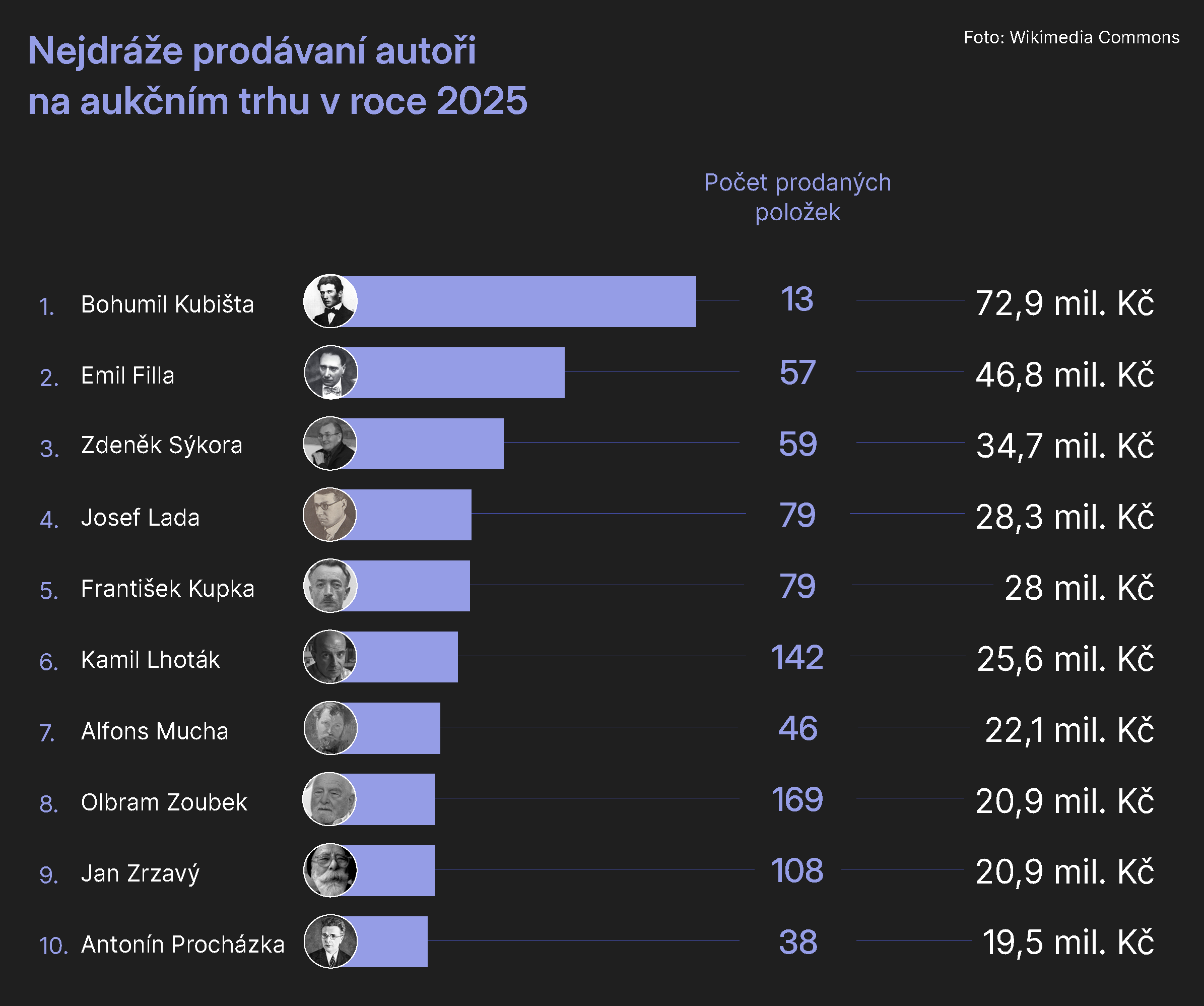 A nyní aplaus pro Bohumila Kubištu, který obsadil první místo v žebříčku nejúspěšnějších umělců a zároveň se stal autorem nejdráže prodaného díla roku. Na druhém místě se umístil Emil Filla a třetí příčka patří Zdeňku Sýkorovi. Favorité předchozích let Toyen a Kupka se v roce 2025 výrazně propadli – od žádného z nich se totiž v roce 2025 v České republice neprodalo dílo překračující hodnotu desítky milionů korun, jak tomu bývalo v minulých letech. První nejúspěšnější žijící autor Michael Rittstein se s prodeji přesahujícími 10 milionů korun objevuje na 21. místě a nedaleko za ním, na 23. příčce, následuje Jiří Sopko s obratem přes 9 milionů korun. Oba autoři zároveň aktuálně patří na špičku žebříčku nejdráže prodávaných žijících autorů na Livebid.