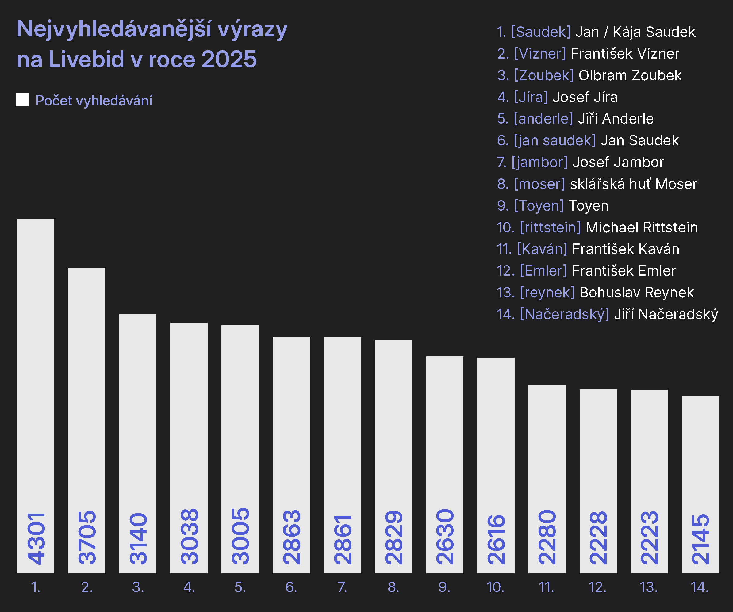 Po jakých autorech a dílech roste největší poptávka? To napovídají výsledky nejvyhledávanějších výrazů více než 37,5 tisíce aktivních dražitelů platformy Livebid. Nejvyhledávanějším pojmem loňského roku se stal Saudek, přičemž šestá příčka nasvědčuje tomu, že se jedná o Jana Saudka. V žebříčku se dále objevují stálice jako Vízner, Jíra, Anderle a Jambor, z prvního místa na třetí pak spadl Zoubek. Mezi nejhledanějšími pojmy se ale neobjevují jen autoři v tradičním slova smyslu. Výrazná poptávka je patrná také po značce Moser, která dlouhodobě patří k velmi sledovaným pojmům na trhu umění a sběratelských předmětů.
