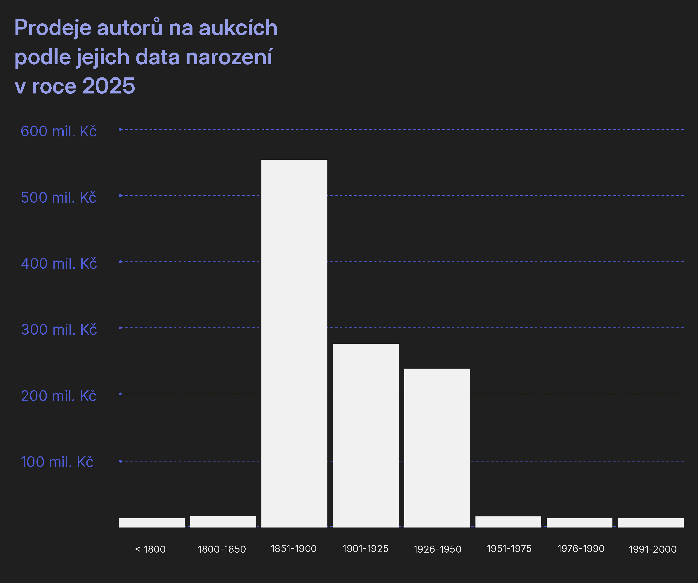 Stejně jako tomu bylo i v předchozích letech, páteří tuzemského aukčního trhu zůstává tvorba konce 19. a počátku 20. století. Největší objem prodejů připadá na autorstvo narozené ve druhé polovině 19. století. Zájem o starší mistry je výrazně nižší a podobně klesá i celkový objem prodejů od počátku 20. století směrem k mladším generacím. Zatímco autorstvo působící na přelomu 19. a 20. století dosáhlo souhrnného obratu téměř tři čtvrtě miliardy korun, současné umění i díla starých mistrů se na aukcích pohybují spíše v nižších desítkách milionů korun.