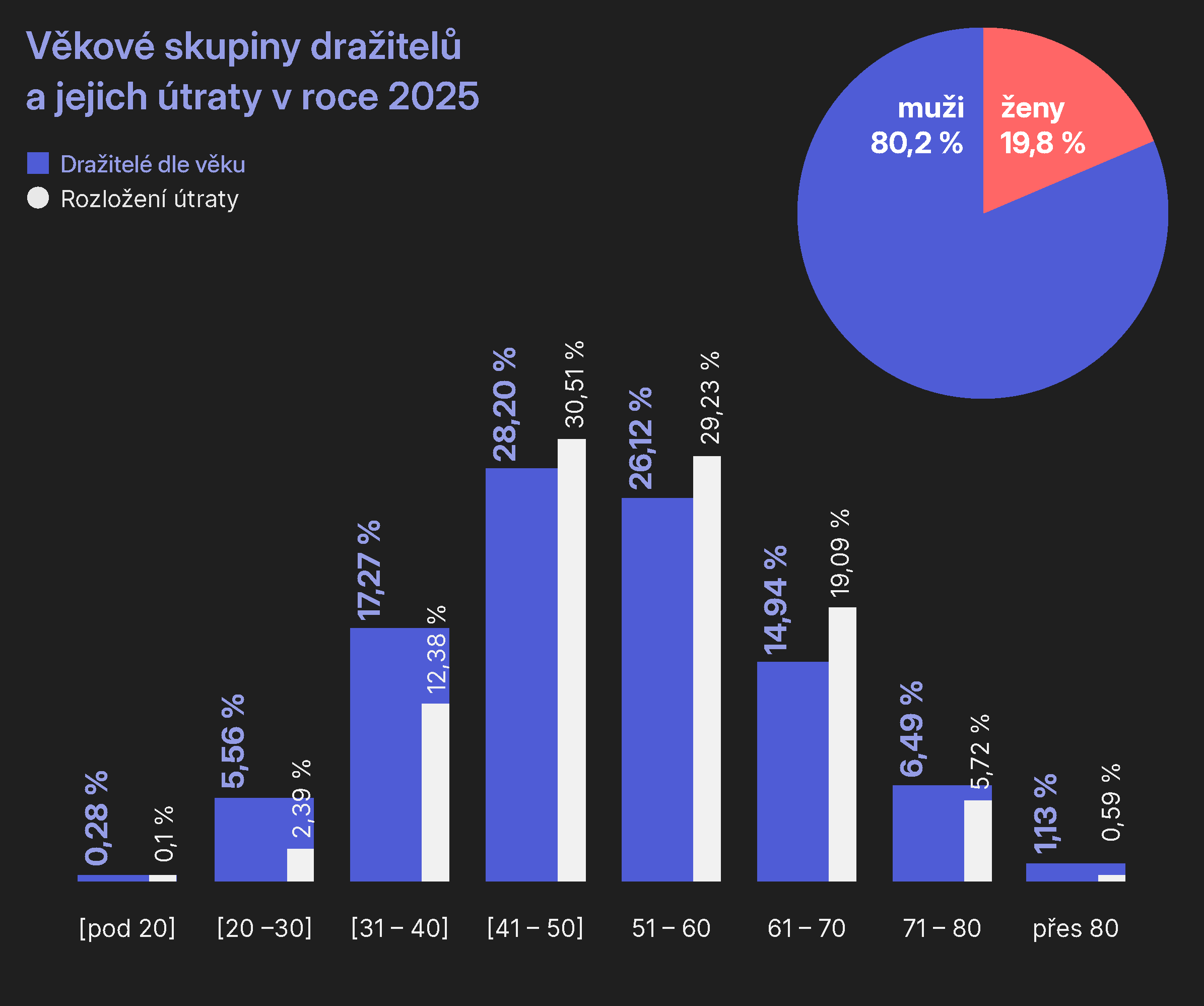 Nyní už víme, co uživatelé Livebid nejvíce zajímá. Kdo ale vlastně jsou a kolik utrácí? Jen za poslední rok na platformě Livebid přibylo 6,5 tisíce nových registrovaných uživatelů. Stejně jako v předchozích letech, i v roce 2025 zůstávají nejsilnější dražitelskou skupinou lidé ve středním věku mezi 40 až 60 lety, kteří tvoří téměř 60 % všech aktivních účastníků aukcí. Tato skupina zůstává nejsilnější i z hlediska útrat, nicméně významnou kupní sílu představují i šedesátníci, kteří v aukcích pokryjí téměř 20 % všech útrat. Z hlediska rozložení pohlaví sice v aukční účasti stále převažují muži, jen za rok 2025 platforma Livebid ovšem zaznamenala nárůst registrovaných dražitelek o 29 %, což značí postupné rozšiřování aukční komunity i mimo její tradiční základnu.