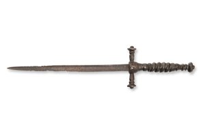 The blade is narrow, double-ground, with a central rib for increased penetration. The handle is profiled with prominent rings for a better grip. Crossbar simple, with flared ends. The blade bears traces of removed corrosion over the entire surface.