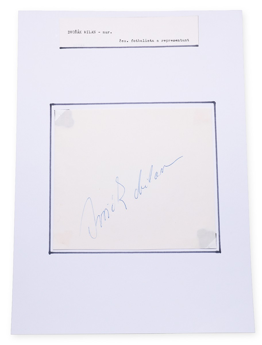 Podpis fotbalisty Milana Dvořáka na samostatné kartičce, přichycené na sběratelském listu. Milan Dvořák (1934–2022) byl československý obránce, známý zejména svým působením v klubu Dukla Praha, se kterým získal několik mistrovských titulů. Reprezentoval Československo na mezinárodní scéně, včetně mistrovství světa ve Švédsku v roce 1958.