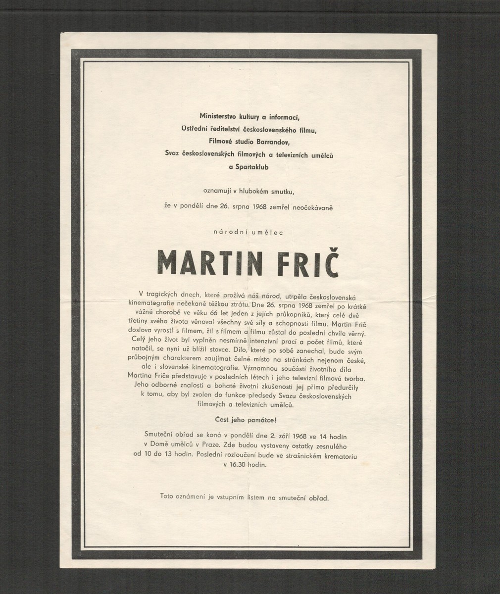 uměleckým jménem Mac Frič, byl český filmový scenárista, herec, režisér a pedagog, sběratelský list o velikosti cca 36x27 cm s úmrtním oznámením