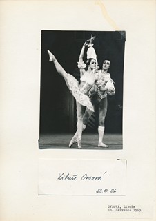 Ovsová Libuše (1963), česká baletka, tanečnice, pedagožka, sběratelský list o velikosti A4 s vlastnoručně podepsanou fotografií o rozměrech cca 11x16cm (datováno 1986) a se sběratelskou kartičkou s vl. podpisem (datováno 1986)