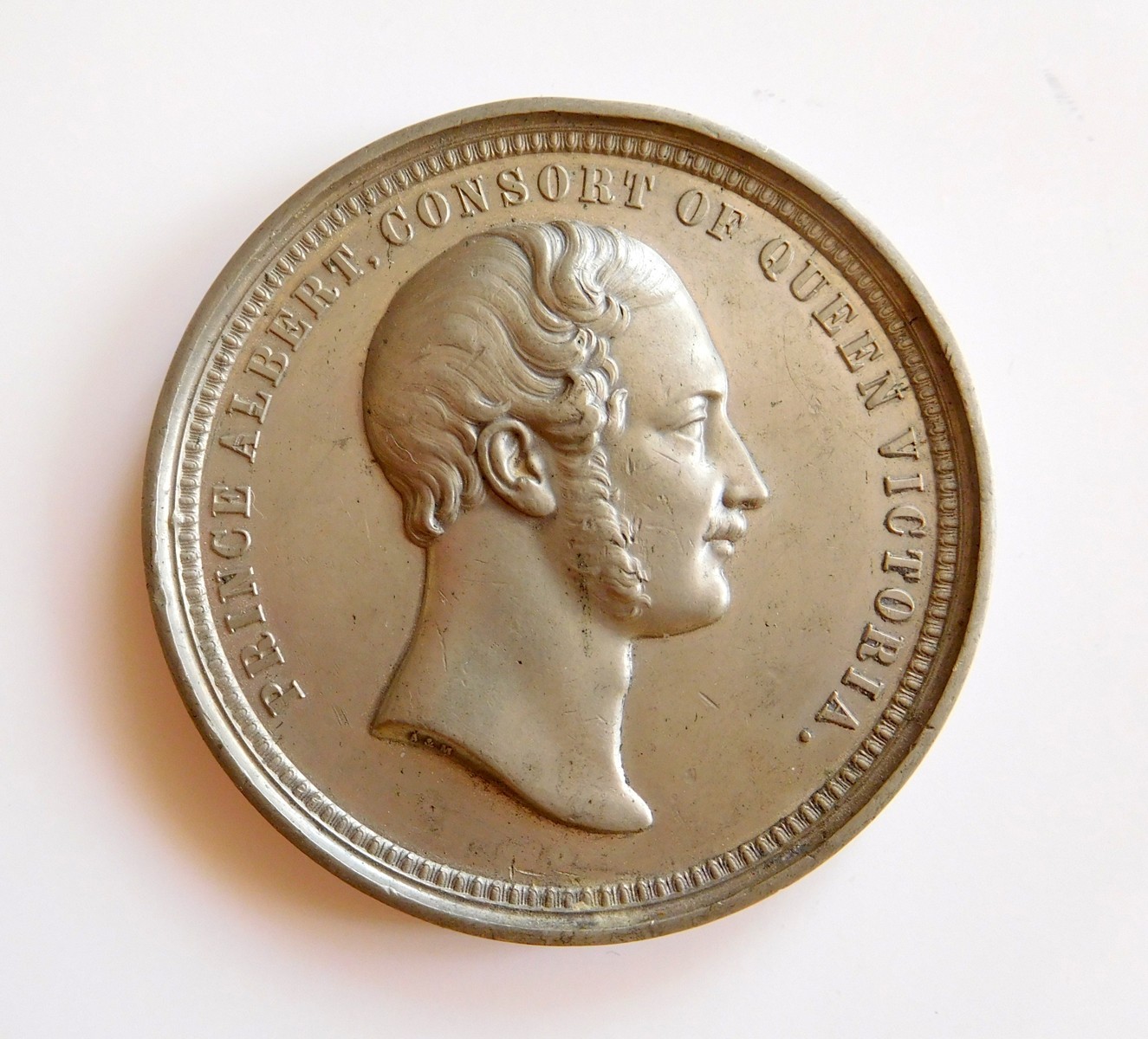 Princ Albert, Konsort královny Viktorie, holá hlava pohled vpravo.,Mezinárodní průmyslová výstava, pohled na Křišťálový palác. Londýn 1851. Materiál - Cín, průměr 51 mm.
