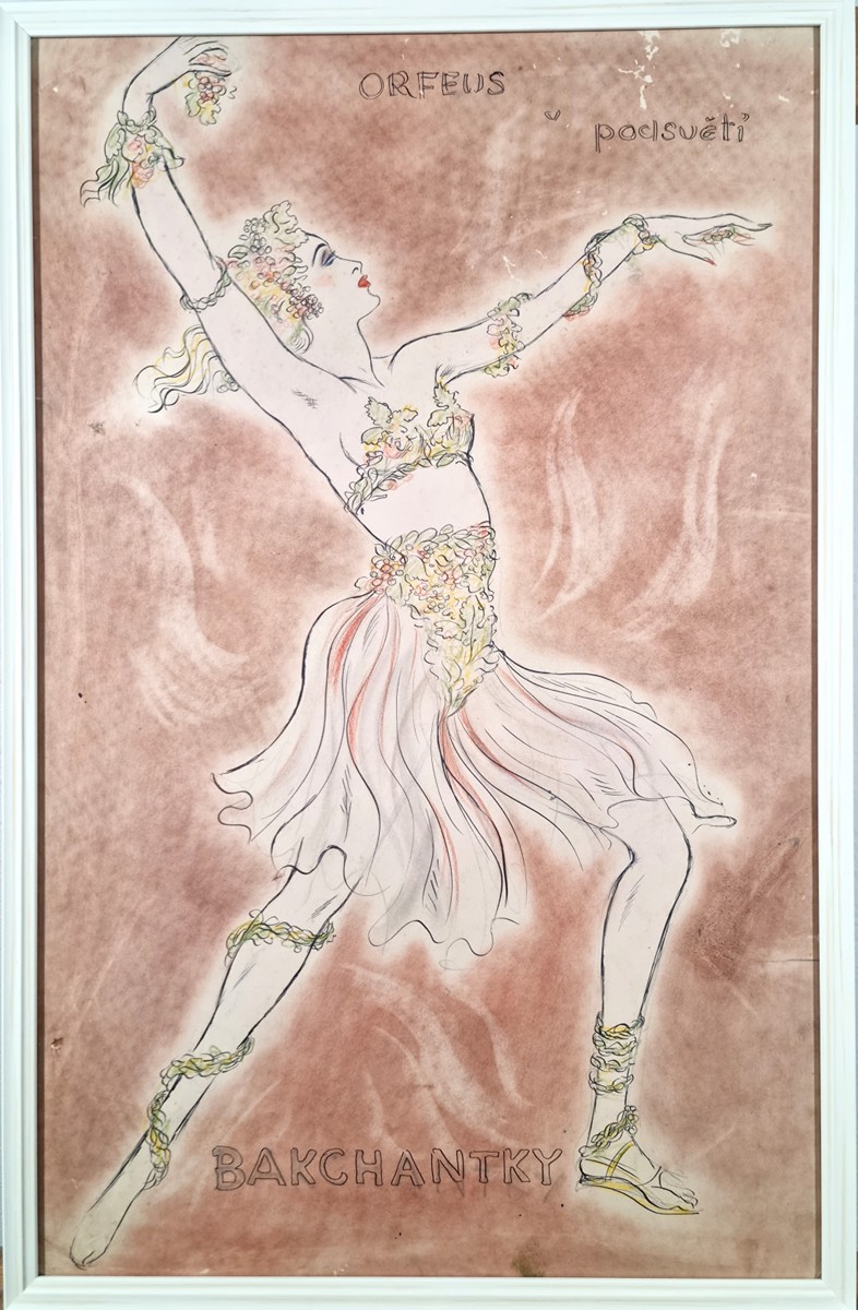 Inspirací pro toto dílo v růžových odstínech se stala mytologie. Celé dílo vyplňuje bakchantka ve víru tance, která je oděna jak kusy látky, tak květinami, které jí obrůstají. Autor se snažil vystihnout charakter této mytologické figury, zachytit volnost, divokost a kouzlo, které se s touto bytostí pojí. Rozvířené je i pozadí za postavou, kresba působí něžně a lehce. Kombinovaná technika na papíře pod sklem, rozměry s rámem 65 x 42 cm, rozměry díla 62 x 39 cm.