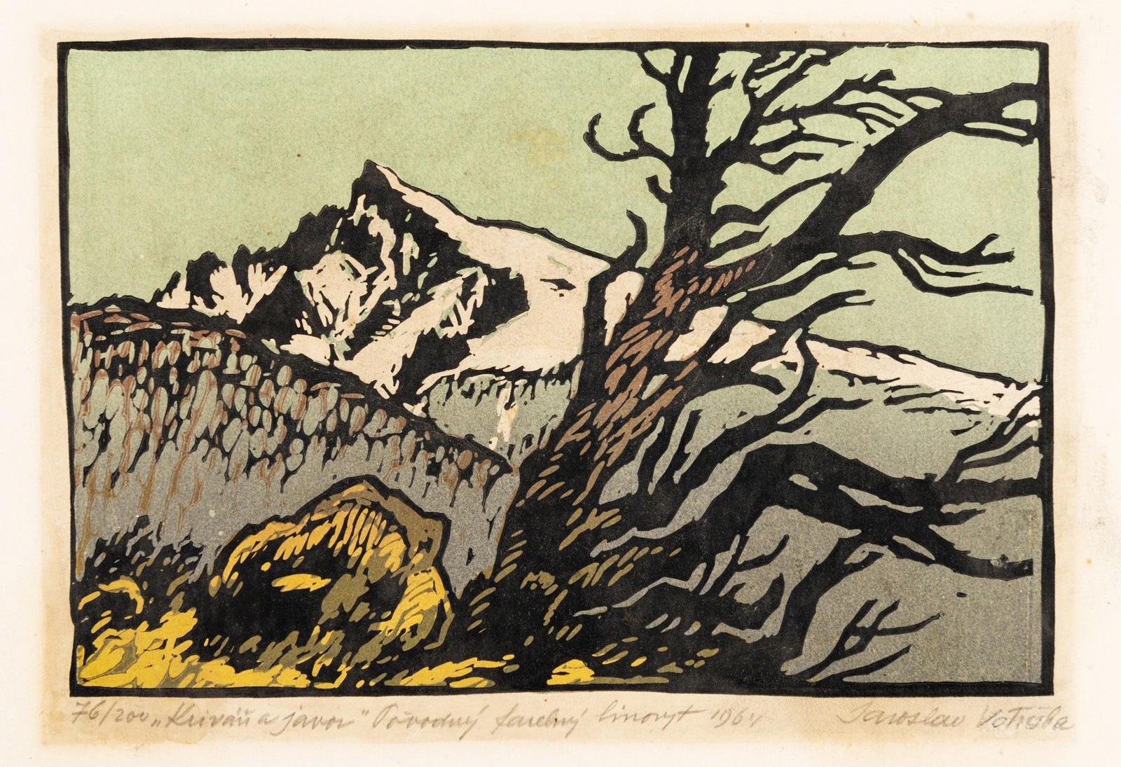 Kriváň a javor - 1964, farebný linoryt na papieri (76. nátlačok z nákladu 200), 16x24 cm, značené vpravo dole „Jaroslav Votruba“