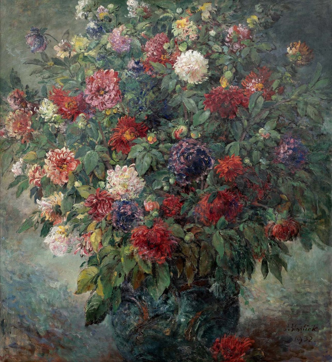 Kytice jiřin - Velmi šťavnaté, s chutí a malířskou bravurou vytvořené zátiší složené převážně z kytice jiřin umožňuje proniknout do zralého období autorovy tvorby, v rámci níž se Blažíček mimo svých oblíbených krajinných záběrů z rodné Vysočiny a chrámových interiérů věnoval právě podobným harmonicky pojatým kompozicím plným vůně, svěžesti a pozitivních emocí. Těmi tehdy nejspíše vyjadřoval radost ze života v rámci asi jednoho ze svých nejšťastnějších období. Představovaná práce se vyznačuje bravurní štětcovou technikou, pevnou kompoziční strukturou Bohumír Matal (1922–1988) Město olej na sololitu, 1971, sign. LD, 28 × 46 cm, rám Bohumír Matal, jedna z nejvýraznějších osobností české poválečné malby, je zde představen prostřednictvím pečlivě vyvážené kompozice spadající do umělcova vyzrálého tvůrčího období počátku 70. let. Tento nejmladší člen Skupiny 42 našel svůj specifický styl v abstrahujících kompozicích inspirovaných svým okolím. Právě ve světě, který ho obklopoval, v každodenních zážitcích či náhodných zkušenostech nacházel krásu protkanou civilistní poetikou, již následně svým jedinečným způsobem zachycoval. V geometricky propracované kompozici stojící na výrazných vertikálách a horizontálách prokazuje Matal nebývalou suverenitu a vynikající talent, díky kterému je schopen pomocí sugestivní mozaiky barevných ploch a výrazných černých linií rozehrát nesmírně působivou hru tvarů a kontrastů. Atraktivitu díla ještě zdůrazňuje fakt, že strýc současného majitele byl blízkým přítelem samotného autora. Při i určitou brilancí, s níž s lehkostí a citem pro detail prodchnul povrch každého předmětu životem. Obrazovou plochu pokryl svým typicky pružným a měkkým rukopisem, jehož plasticitu ještě místy umocnil pastózním nánosem barev. Tímto mj. prokázal nejen své výtvarné nadání, ale i silnou schopnost reflektovat dlouhou evropskou tradici zátiší jako svébytného žánru, který si dokázal plně osvojit a navíc ještě osobitě rozvinout. Prezentováno ve vkusné původní Eckově adjustaci. Obraz je uveden v soupisu díla v monografii PhDr. N. Blažíčkové-Horové a PhDr. E. Havlové (kat. č. 449). Při konzultacích posouzeno Mgr. M. Dospělem, Ph.D.