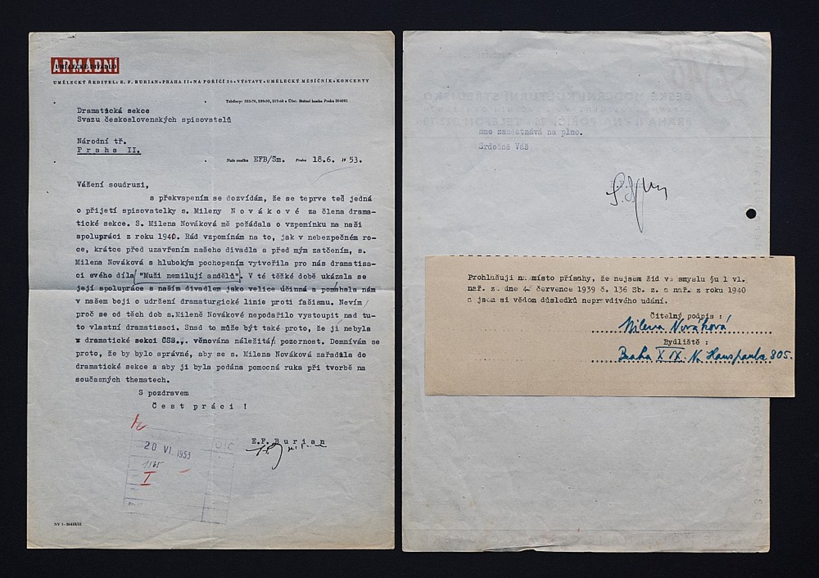 | popis | 2x ručně podepsaný dopis (strojopis), 1x na papíře s hlavičkou D48 ohledně instalované výstavy v divadle, 1x na papíře s hlavičkou Armádního divadla: v dopise adresovaném Dramatické sekci Svazu ČS spisovatelů doporučuje spisovatelku Milenu Novákovou k zařazení do dram. sekce s poukazem na její výpomoc divadlu i E.F. Burianovi osobně v r. 1940 v boji proti fašismu; přiložen strojopisný ústřižek podepsaný jmenovanou, na kterém prohlašuje, že není židovského původu |