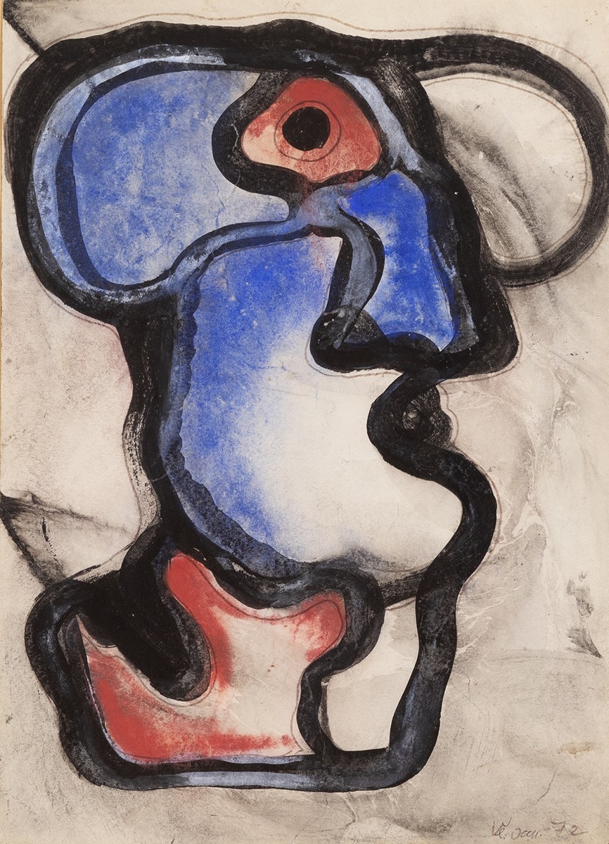 kvaš, tuš, papír | 1972 | 42 x 30 cm | sign. PD Vě. Jan. 72 | rám | Sochařka Věra Janoušková se proslavila nejen svými osobitými plastikami ze smaltovaných plechů, ale rovněž i navýsost originálním přístupem při tvorbě svých koláží a kreseb. Nabízená položka představuje vzácnou ukázku tvorby z počátku 70. let, kdy v její tvorbě kulminovala tvorba soch kombinujících především modré a červené smalty. Autorka patří mezi hlavní představitele Nové figurace 60. a 70. let a nejvýznamnější české umělkyně 20. století. Spolu s dalšími výraznými umělkyněmi jako např. Adrienou Šimotou a Alenou Kučerovou působily v legendární umělecké skupině UB 12.