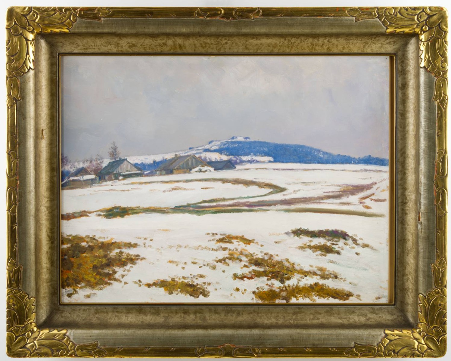 "Hradiště in Winter" from 1910 represents a highly authentic and exceptionally valuable collector`s document of the peak creative period of František Kaván, in which the artist definitively abandons Symbolist melancholy and fully returns to pure Realism imbued with a deep feeling for the Czech landscape. The location at Přední Hradiště near Vítanov, which became Kaván`s fated retreat after his second return to the Highlands (1909), is not a mere topographical detail but a manifesto of the artist`s sense of belonging to the harsh yet picturesque character of the Hlinsko region. The technique of oil on paper was for Kaván an ideal medium in this period for immediate plein-air recording, enabling him to capture fleeting atmospheric changes with brilliant ease and speed. The style of the painting is characterised by a confident, almost impressively liberated facture, where the artist does not use colour for mere description but for the building of mass and space. The palette is constructed on a superbly composed interplay of cool valeurs of white, bluish and grey, which in the foreground contrast with the ochre and earthy tones of emerging vegetation and the brown of rural buildings, thereby creating a plastic impression of thawing and the specific humidity of winter air. The composition, with the diagonal of the road leading the viewer`s eye toward the horizon of the dominant Hradiště hill, demonstrates the artist`s sensitivity to monumentality even in an intimate format. The exceptionality of this particular piece is underscored by its unquestionable provenance and exhibition history, documented by labels from the key Jubilee Exhibition in Hlinsko in 1941 (cat. no. 21) and the prestigious retrospective Výtvarné Hlinecko 1962 (cat. no. 107) held under the scholarly auspices of the National Gallery in Prague, making the work a first-rate gallery item with exceptional collector`s potential.